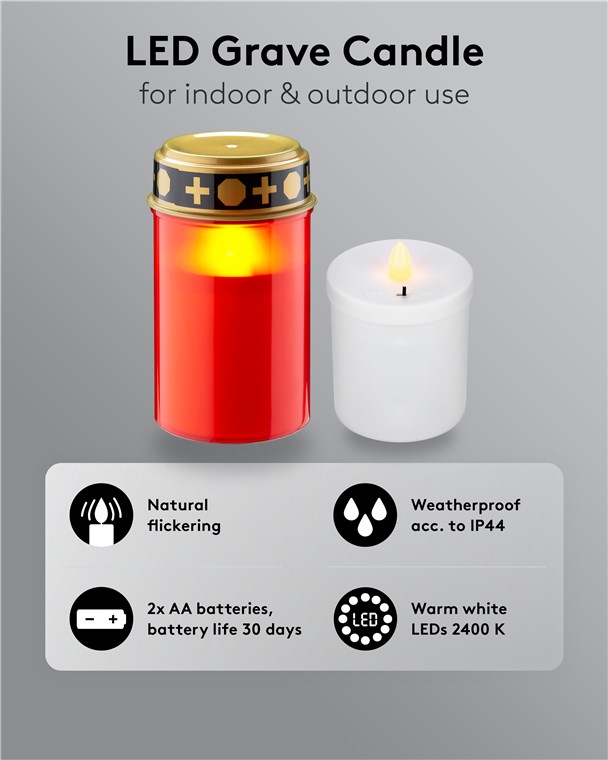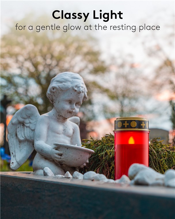 Neem contact opEer uw dierbaren met een warm en blijvend licht. Deze rode LED devotie kaars combineert de authentieke uitstraling van een traditionele kaars met de veiligheid en het gemak van moderne technologie. Dankzij de realistische 3D-vlam en de warm-witte lichtkleur (2400 K) creëert deze kaars een serene sfeer van devotie op begraafplaatsen, bij gedenktekens of in uw eigen huis.