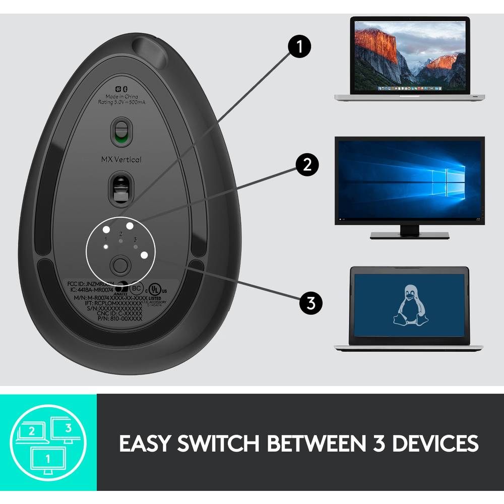 Onderop de muis zit een knop waarmee je tussen 3 verschillende apparaten kunt schakelen. Zo kun je bijvoorbeeld met één druk op de knop wisselen tussen je desktop (via Unifying) en je laptop (via Bluetooth).