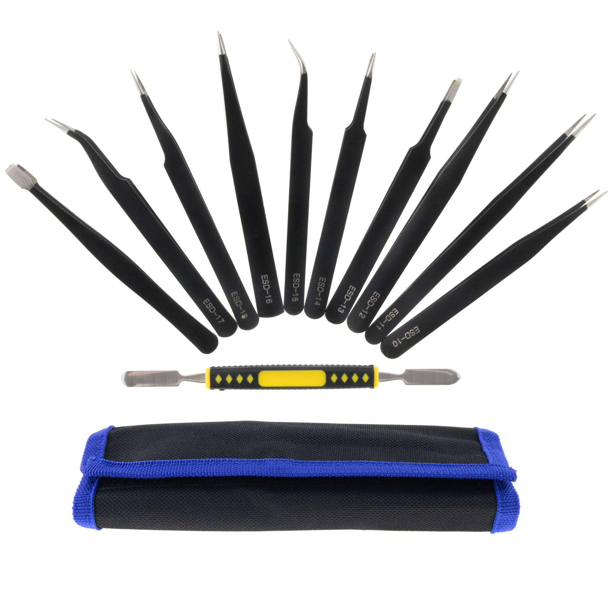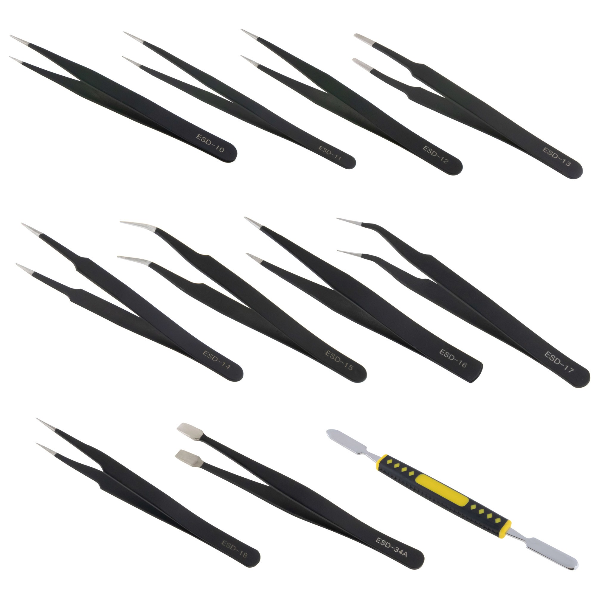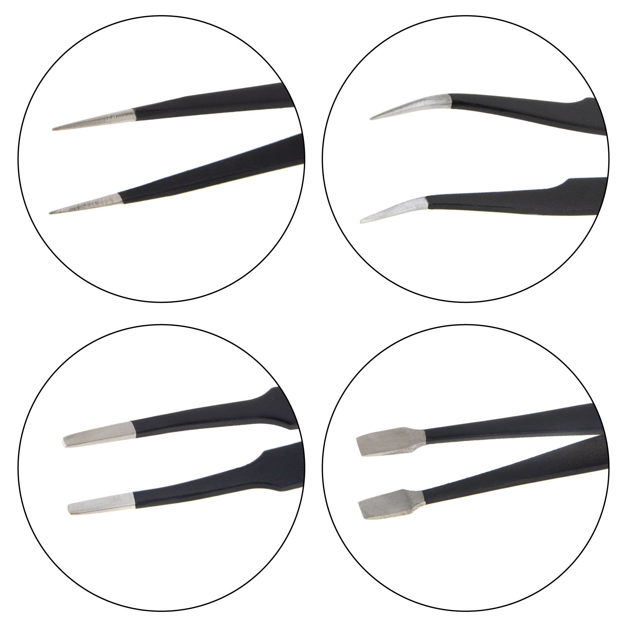 10x ESD Precisie Pincet: Een gevarieerd assortiment (recht, gebogen, breed en spits) voor maximale veelzijdigheid.