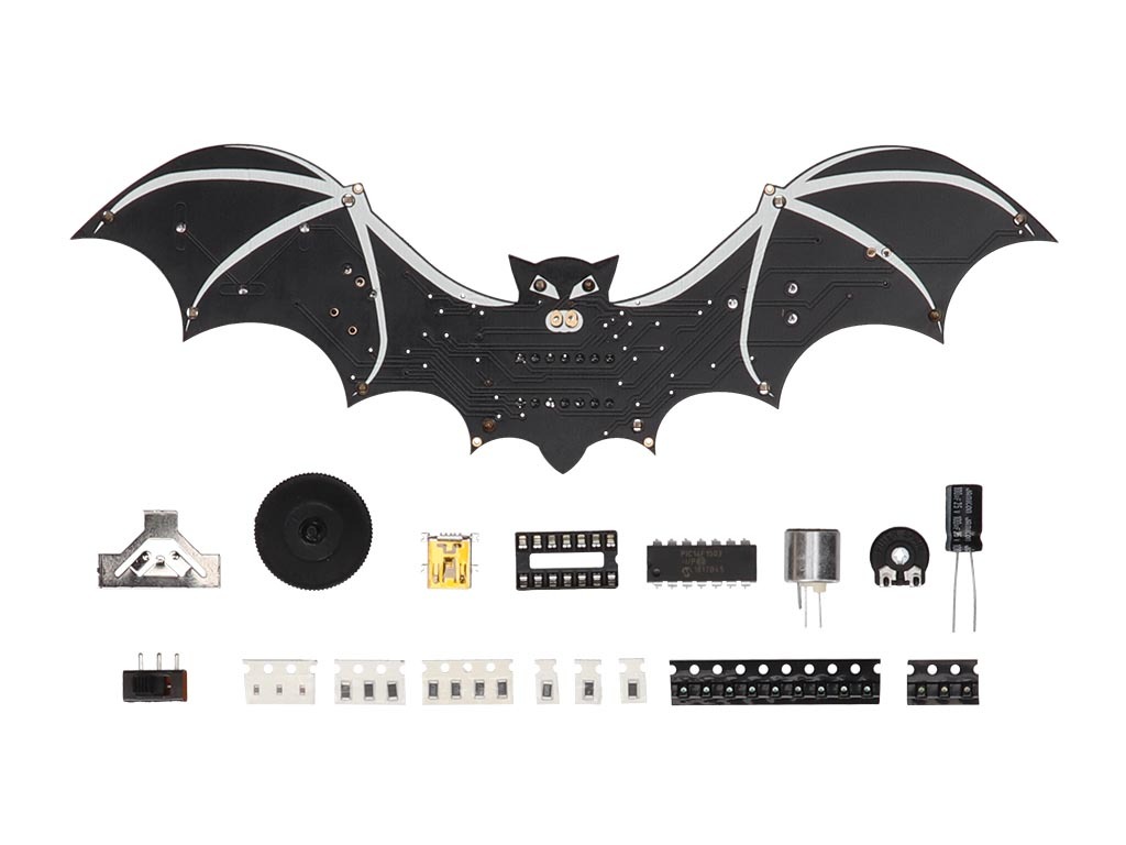 Dit Halloweengadget ziet eruit als een griezelige vleermuis en heeft een matzwarte kleur met witte coating. De printplaat is voorzien van 4 gaten om de vleermuis klauwen te geven, of om het gadget op te hangen.