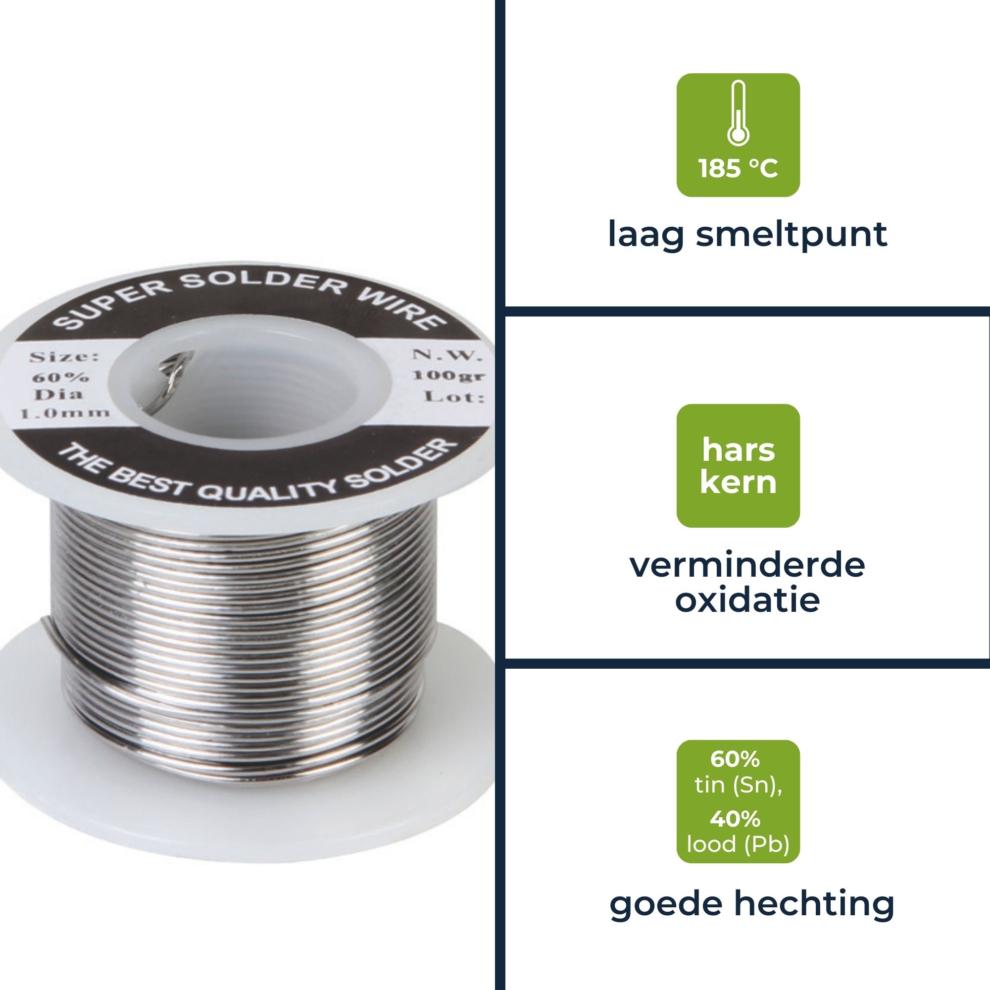 Neem contact opBen je op zoek naar betrouwbaar soldeer van uitstekende kwaliteit? Dan is dit soldeertin met harskern precies wat je nodig hebt! Het bestaat uit 60 % tin (Sn), 40 % lood (Pb), heeft een diameter van 1 mm en is het gewikkeld op een rol van 100 g. Het smeltpunt bedraag 185°.