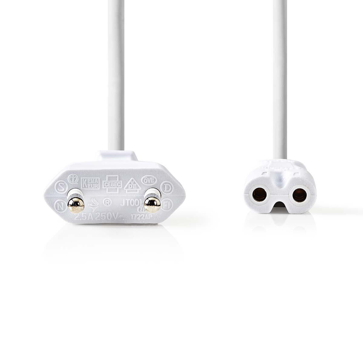 Neem contact opVervang uw oude kabel of kies voor een langere variant met dit universele witte voedingssnoer. Deze kabel, in de volksmond ook wel het "achtje" genoemd vanwege de vorm van de C7-connector, is de meest gebruikte stroomkabel voor apparaten die geen randaarde nodig hebben.